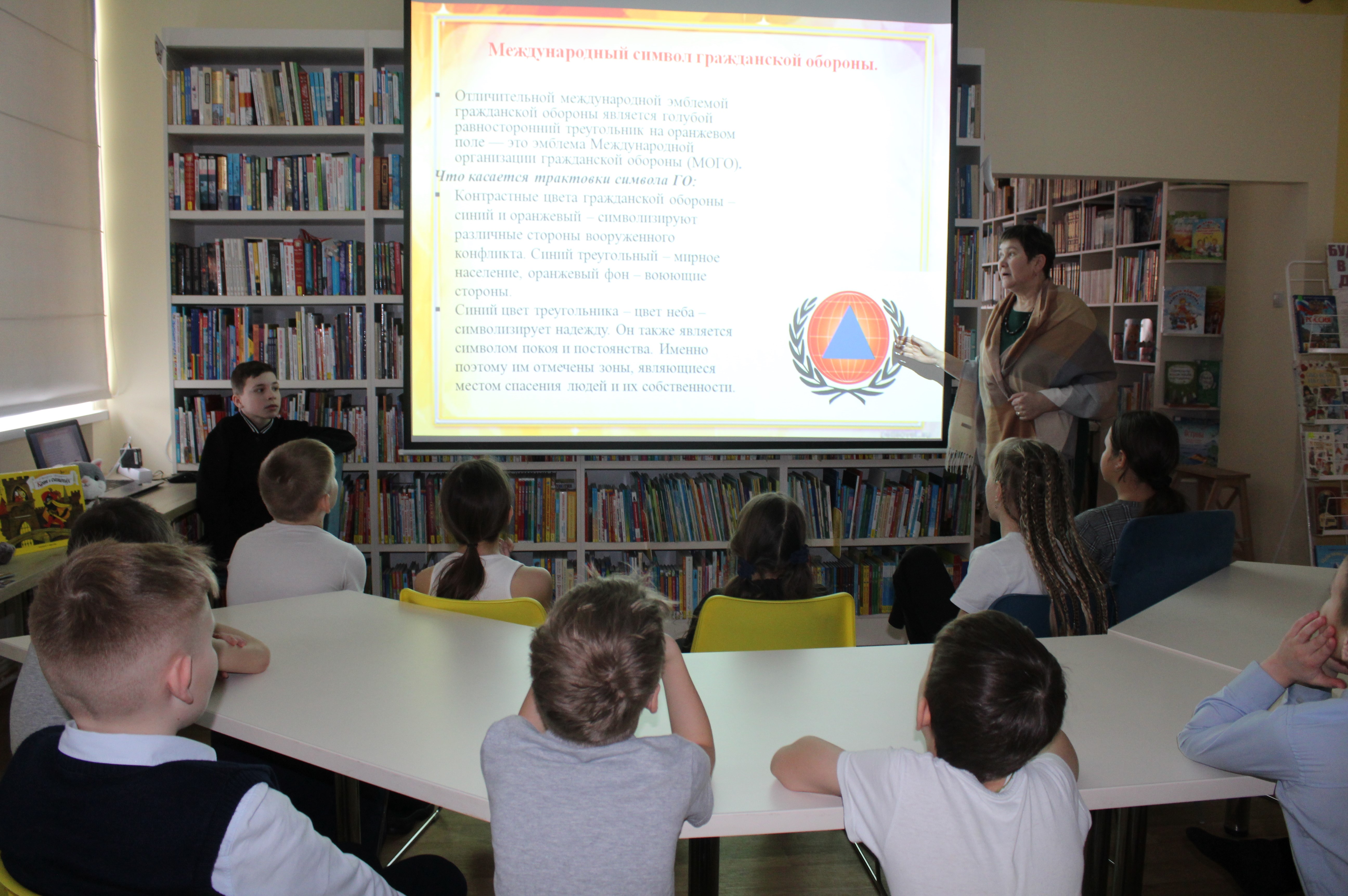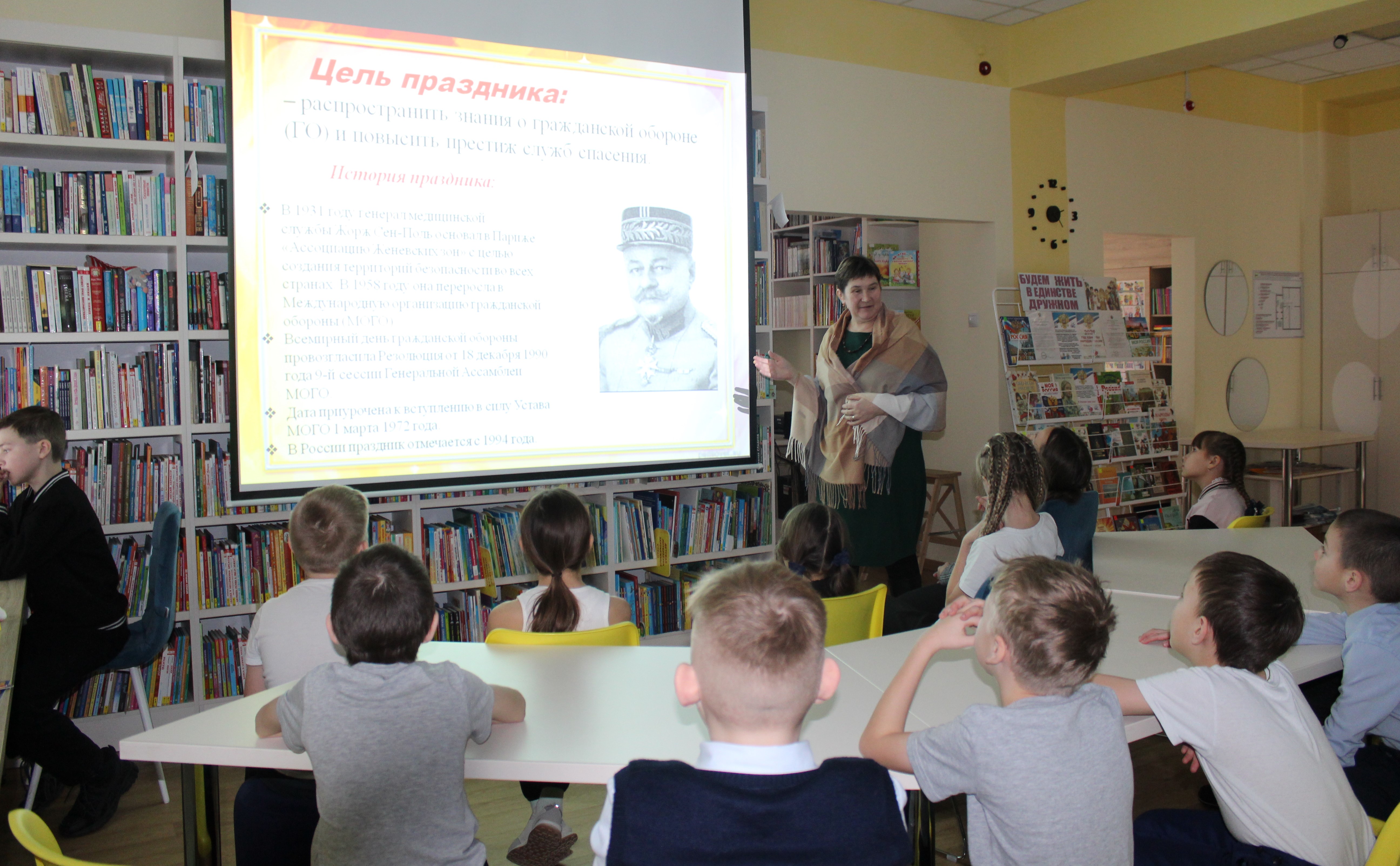 Используя презентацию, библиотекари рассказали о том, что в 1931 г. французский генерал медицинской службы Жорж Сант-Пол основал в Париже организацию «Ассоциация Женевских зон», которая впоследствии была преобразована в Международную организацию гражданской обороны. В России государственная организация защиты населения берет свое начало в 1932 г., когда было утверждено положение о местной противовоздушной обороне.
