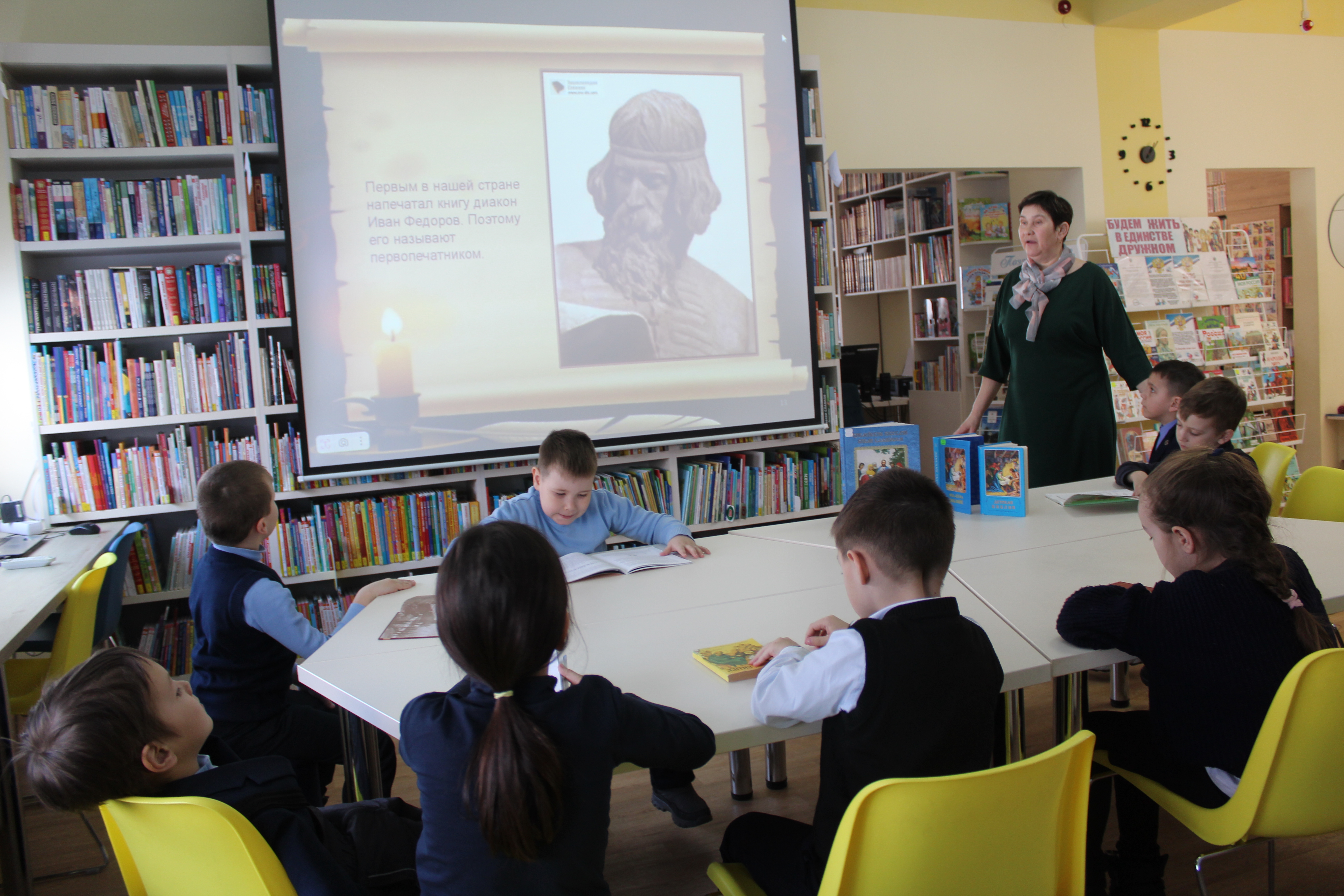 С помощью медиапрезентации «День православной книги» библиотекари рассказали ребятам об истории праздника, создании первой книги на Руси, причинах возникновения книгопечатания и выборе церковной книги для печати. Юные читатели узнали о жизни первопечатника Ивана Фёдорова. Им также представили издания Детской Библии и Православной азбуки.