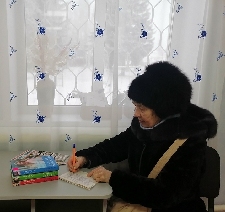 Елена Леонидовна Петрова стала первой читательницей в этом году. Она постоянный посетитель библиотеки и любит читать книги чувашских авторов и романы.